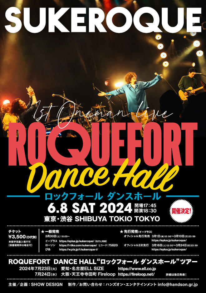 6月8日渋谷TOKIO TOKYOにて開催されるワンマンライブ<ROQUEFORT DANCE HALL ”ロックフォール ダンスホール”>は、皆で楽しく笑顔で踊れる、体を揺らす、口ずさめる空間と時間、というテーマでSUKEROQUE初のワンマンライブ。馴染みのサポートバンドメンバーとのグルーヴィ&メロウなアンサンブル、そしてSHOHEIの笑顔とユーモアを交えたキャラで楽しませてくれそうだ。