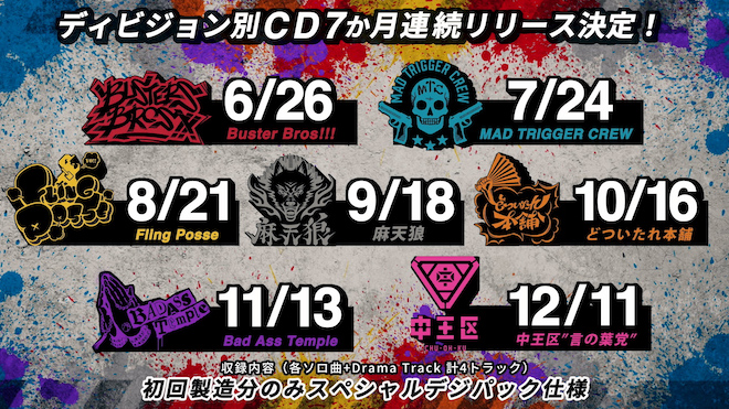 6月26日のイケブクロ・ディビジョン“Buster Bros!!!”を皮切りに、7月24日にヨコハマ・ディビジョン“MAD TRIGGER CREW”、8月21日にシブヤ・ディビジョン“Fling Posse”、9月18日にシンジュク・ディビジョン“麻天狼”、10月16日にオオサカ・ディビジョン“どついたれ本舗”、11月13日(水)にナゴヤ・ディビジョン“Bad Ass Temple”の6ディビジョン、12月11日に中王区“言の葉党”によるCDが連続リリースとなる。