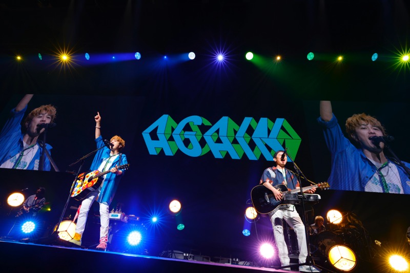衣装チェンジを行い再びステージに登場したゆずは、野毛大道芸、そして25名のAGAG(アゲアゲ)ダンサーズとともにダンスチューン「LOVE & PEACH」へ。続いてライブ参加グッズのフラッグが会場中にたなびいた「Frontier」を届けると、北川は「この会場から程近い伊勢佐木町で、1996年より路上ライブを行なっていた」ことを話し、当時、数少ない持ち曲で演奏していたなかから、ミディアムバラード「春風」を披露した。また、終始ソリッドなバンド演奏を鳴らす“AGAG(アゲアゲ)バンド”の紹介を挟み、近年のライブ定番曲「公私混同」から、不動のライブ曲「夏色」へ。2番からは北川が客席を縦横無尽に動き回り、この日一番の盛り上がりを見せた。