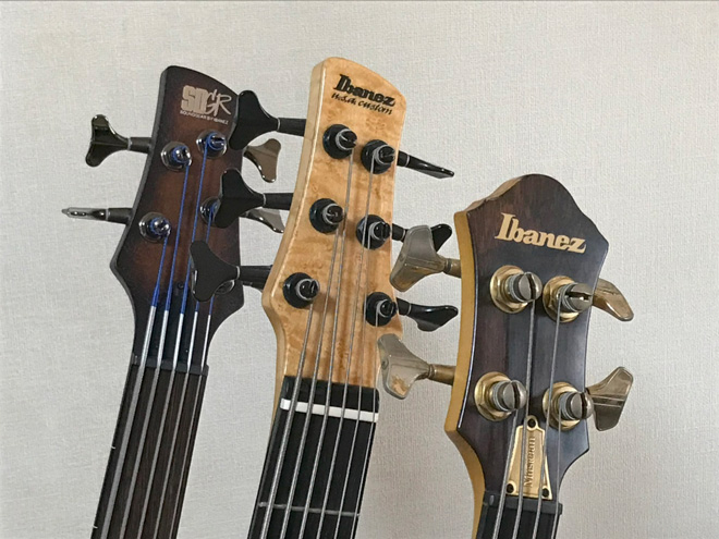 30年もの開きがあるのに、この統一感。すごい。ボディーシェイプが同じままだから、抱えたときのフィット感はそのまま身体に馴染んでいることでしょうね。それにしても4弦、6弦、5弦フレットレス…と見事なまでの無駄なき完璧ラインナップなわけですが、理解されない家人からは「なんで同じものがそんなにたくさんあるの?整理してね」と邪魔者扱いされる未来が見えた。私だったら4弦フレットレスや5弦フレッテッドへの思いを断ち切れないだろうなぁ。妄想しただけで胸が苦しくなる思い。それが楽器人の性。ああ無情。(JMN統括編集長 烏丸)