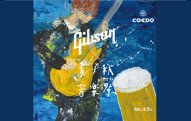 麦ノ秋音楽祭への参加を記念して、当日会場では“音ト鳴(おととなり)brewed by COEDO BREWERY”を特別仕様のラベルで彩ったコラボレーション・エールを限定販売。ライブペインティング・パフォーマー 近藤康平がギブソン・プレイヤーをモチーフに描き下ろしたイラストがあしらわれたラベルになっている。