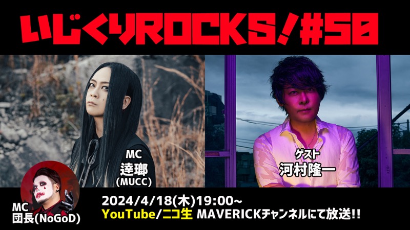 MUCCの逹瑯とNoGoDの団長がMCを務めるMAVERICK DC GROUP公式配信番組『音楽情報ライヴ「いじくりROCKS!」』が4月18日、2020年2月の配信開始より記念すべき放送50回目を迎える。そのスペシャルゲストとしてLUNA SEAのヴォーカル河村隆一の生出演が決定した。