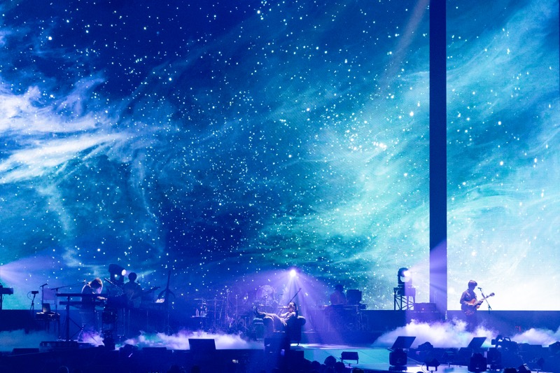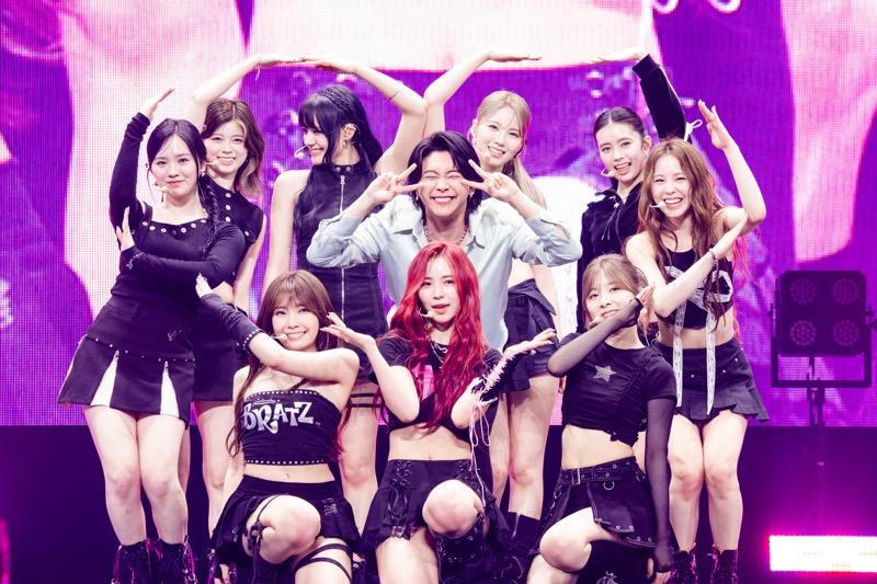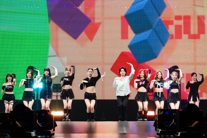 まず12日(金)のNiziUのステージでは、「HEARTRIS」で大森元貴(Vo, G)がサプライズでステージに登場。驚きの歓声に包まれるなか、“テトリスダンス”ほか見事に息の合ったフォーメーションダンスを見せて客席を沸かせた。