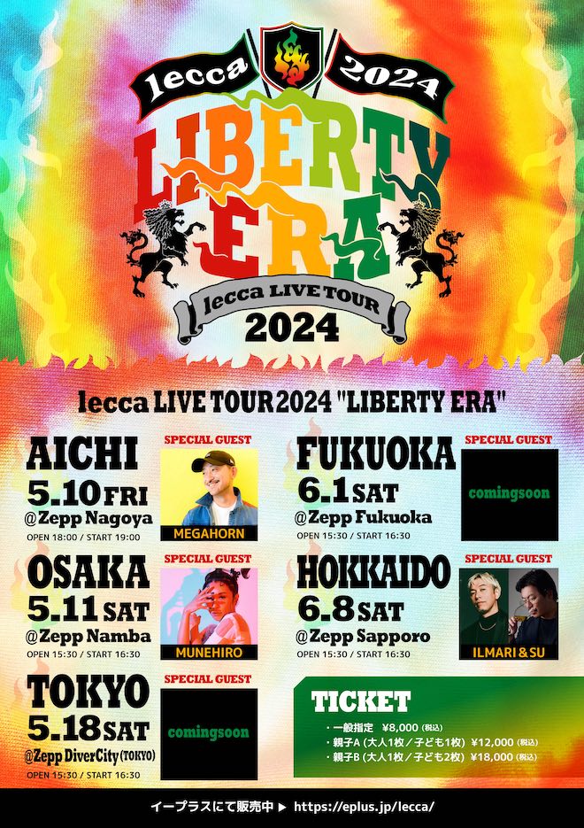 5月10日の名古屋公演には、「スペシャルサマー feat.lecca」でコラボをしたMEGAHORN、翌5月11日の大阪公演には、「オンナForever welcomez lecca & MUNEHIRO」でコラボをしているMUNEHIRO、そしてツアーファイナルとなる6月8日の札幌公演には、「HI-TEN feat. ILMARI & SU」でお馴染みのILMARI & SUを迎える。