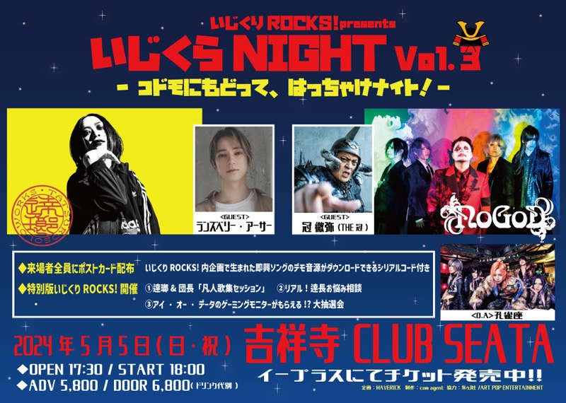 その放送50回記念イベントとして、5月5日(日/祝)に吉祥寺CLUB SEATAで開催される番組初の有観客イベントが<いじくらNIGHT Vol.3 ~コドモにもどって、はっちゃけナイト!~>だ。逹瑯と団長がそれぞれゲストを招くことは発表されていたが、逹瑯のステージに声優のランズベリー・アーサー、NoGoDのステージに番組の準レギュラーともいえる冠徹弥(THE 冠)がゲスト出演することが本日の放送で発表された。そして、オープニングアクトを務めるのは、YUKKE(MUCC)プロデュースのMAVERICK DC GROUP公式番組『Mr.JACKが斬る!』出演者の中から選ばれた若手ヴィジュアル系バンド孔雀座となる。