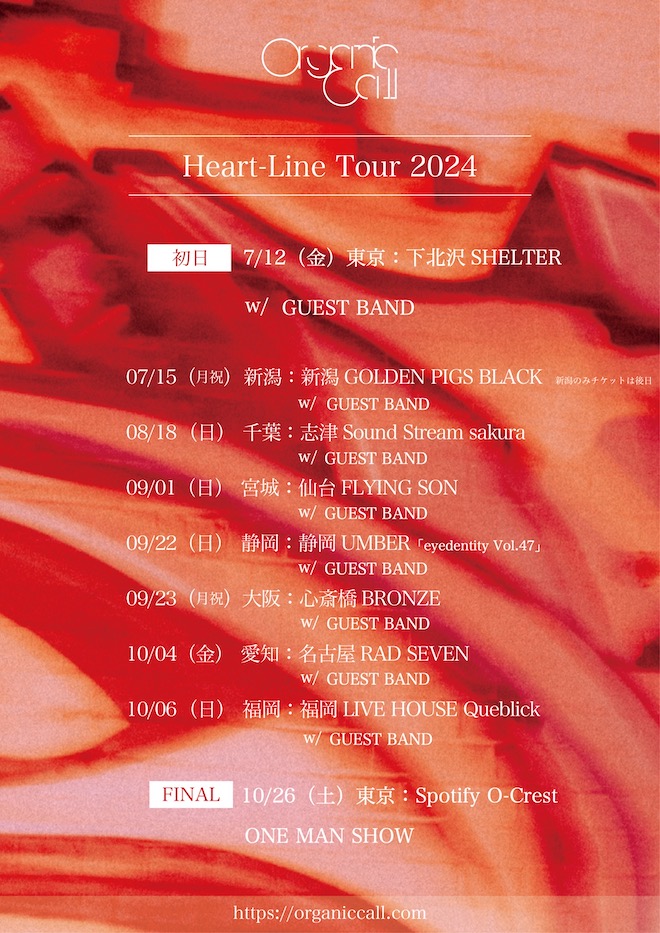 また、それに伴い全国9ヶ所を周る<Heart-Line Tour 2024>も開催される。本ツアーは、初日7月12日に下北沢SHELTERからスタートし、ファイナルは10月26日にSpotify O-Crestにてワンマンライブを行う。チケットは本日21時から発売開始している。