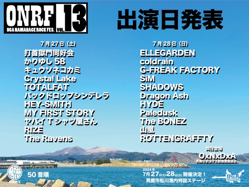 野外フェス<OGA NAMAHAGE ROCK FESTIVAL vol.13>が2024年7月27日および28日の2日間、秋田県男鹿市船川港内特設ステージで開催される。このたび同フェス出演アーティストの日割りが発表となった。