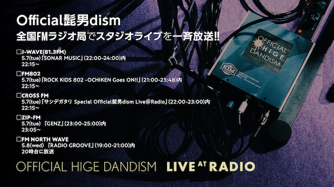 J-WAVE(81.3FM)「SONAR MUSIC」、FM802「ROCK KIDS 802 -OCHIKEN Goes ON!!」、CROSS FM「サシデガタリ Special Official髭男dism Live@Radio」では各番組内で5月7日22時15分より各局の生放送番組をジャックし、異例の同時放送を予定。