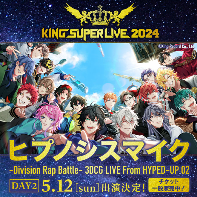 5月11日(土)・12日(日)にKアリーナ横浜にて開催される、キングレコード主催の大型フェス<KING SUPER LIVE 2024>DAY2の追加出演者として、『ヒプノシスマイク』の3DCGライブ「ヒプノシスマイク -Division Rap Battle- 3DCG LIVE From HYPED-UP 02」の出演が新たに決定した。