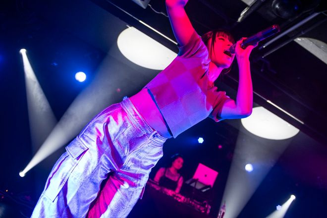 続けて「BaNe BaNe feat. DOTAMA」を披露し、先ほどとは打って変わって会場が一気にドリーミーな#KT劇場へ。4曲目の「ぴーおーぴー」では、曲途中で自らトラックを止め、アーティスト活動への決意のこもったアカペララップを披露し、フロアからは大きな拍手が巻き起こった。#KTちゃんの地元である「夜の横浜」をイメージ した5曲目「PIKA PIKA」では、#KTちゃんのブレッシーな歌声とミラーボールの明かり、観客の手が合わさり会場がドリーミーなムードに包まれた。