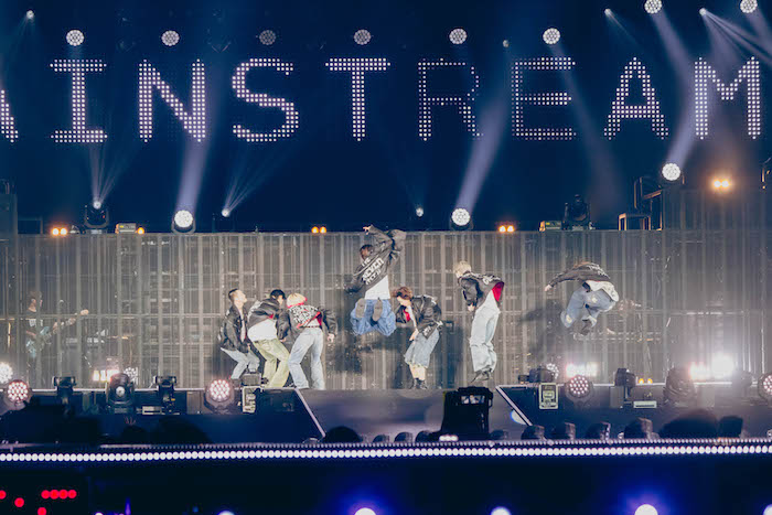 5万人の歓声が上がる中、「Mainstream」へ。シングルの表題曲としては初めてメンバーがいちから制作に携わった楽曲であり、J-POPのフォーマットから逸脱したノンタイアップのヒップホップチューンにもかかわらず、音楽チャート全116冠を達成。ど迫力の「Mainstream」にどよめきが上がるが、もちろんBE:FIRSTは手を休めない。