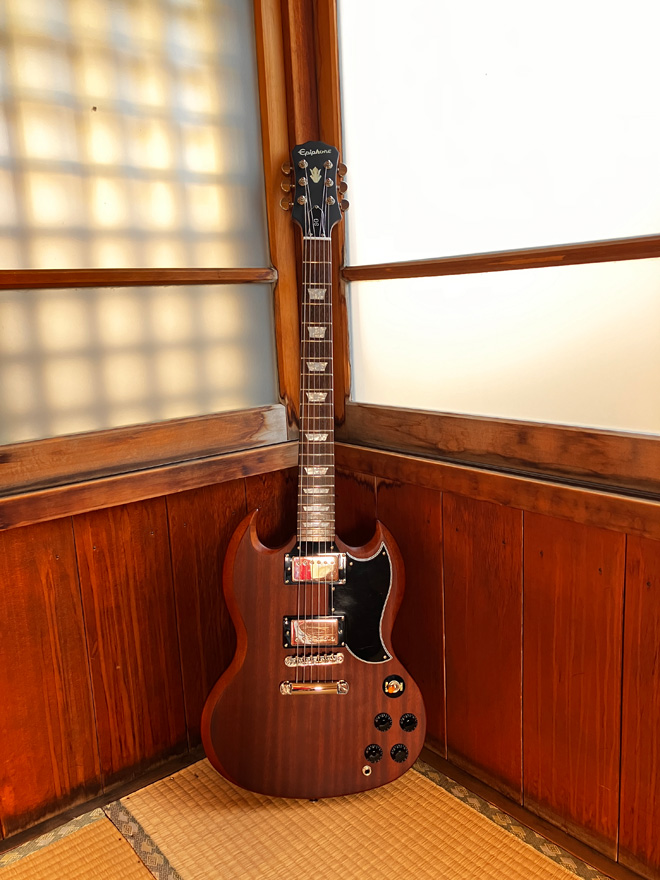 ナイスな一枚ですね。SGなんて純アメリカ産のギターなのに、日本家屋の風景にバッチリ馴染んでいるこの感じ、なんて素敵なんでしょう。日本家屋のキャパシティが大きいのか、それともSGが国籍を問わないユニバーサルなデザインを有していたのか。SGってマホ1枚だからなのか、マホの質…芯材か辺材かの違いなのか、暖かくぶっといサステイン豊かなサウンドのものもあれば、ジャキッとキレの良いトレブリーなものもありますよね。こちらはどっちのタイプなんでしょう。(BARKS 烏丸哲也)