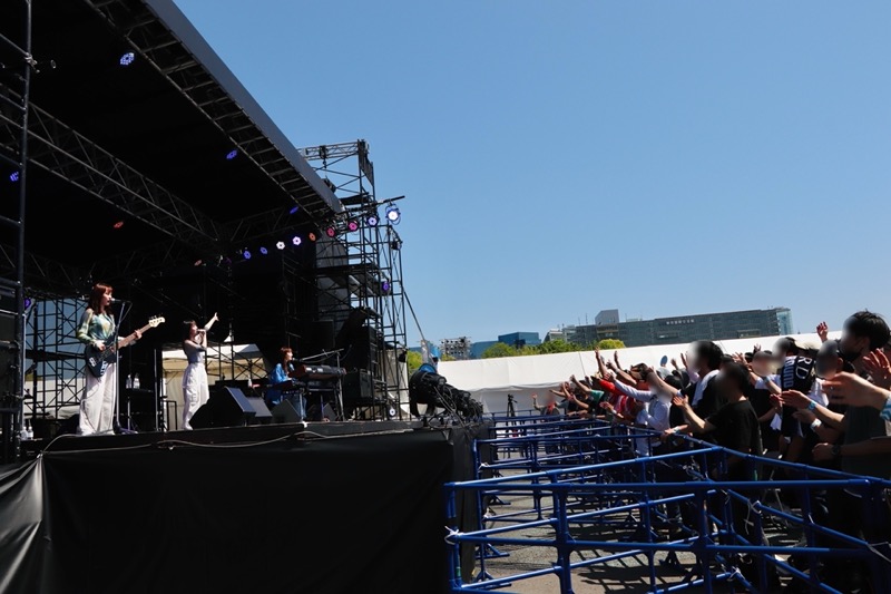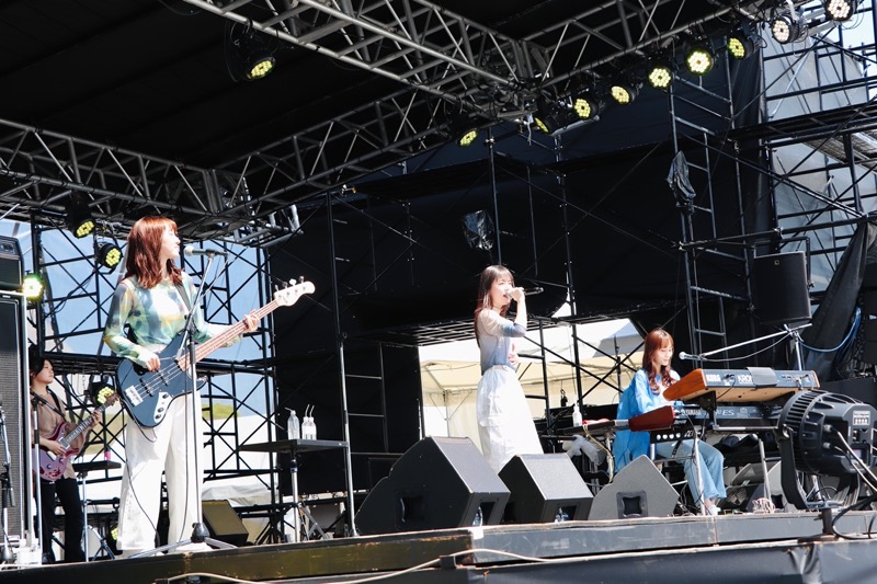 オープニングを飾ったのはZARDの夏の名曲カバー「揺れる想い」だ。“♪青く澄んだあの空のような〜”という歌詞の通り、雲ひとつない快晴の真っ青な空のもと、清涼感あふれるバンドサウンドと神野友亜(Vo)の伸びやかな歌声が会場に響きわたる。続く2曲目もZARDの名曲カバー「きっと忘れない」だった。神野のボーカルに、杉岡泉美(B)、坂本ひろ美(Key)のコーラスを加えて深みを増した歌い出しが美しく、集まったオーディエンスが一気に引きつけられた。