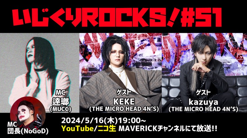 MUCCの逹瑯とNoGoDの団長がMCを務めるMAVERICK DC GROUP公式配信番組『音楽情報ライヴ「いじくりROCKS!」』が5月16日、YouTubeとニコ生にて生配信される。放送51回目のゲストとして出演するのはTHE MICRO HEAD 4N’SのKEKE(Vo)とkazuya(G)だ。