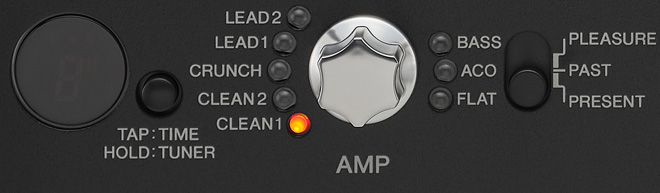 本製品のコントロール部にある「OWN MEMORY」には、松本氏が監修した5つのサウンドがプリセットされているので、「TAK TONE」と称される松本氏ならではの極上のサウンドを瞬時に呼び出すことができます。さらに、松本氏自らネーミングした3つのアンプモード「PLEASURE」「PAST」「PRESENT」のうち、PRESENTとPASTそれぞれに割り当てられるアンプタイプ「CLEAN」「CLUNCH」「LEAD」は、松本氏のサウンドを忠実に再現しています。
