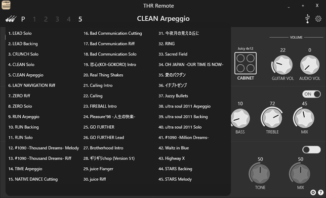 無料の専用アプリケーション「THR Remote」(iOS/Android/Win/macOS対応)では、より細やかな音作りや本体では操作できない追加パラメーターを簡単にエディットできます。今回このアプリに、本モデルでのみ使用できる、松本氏の特徴あるギターサウンドを特別に30種類以上プリセットしました。ユーザーは自由に音作りを楽しめるのはもちろん、プリセットから「TAK TONE」を呼び出して手軽に演奏することも可能です。