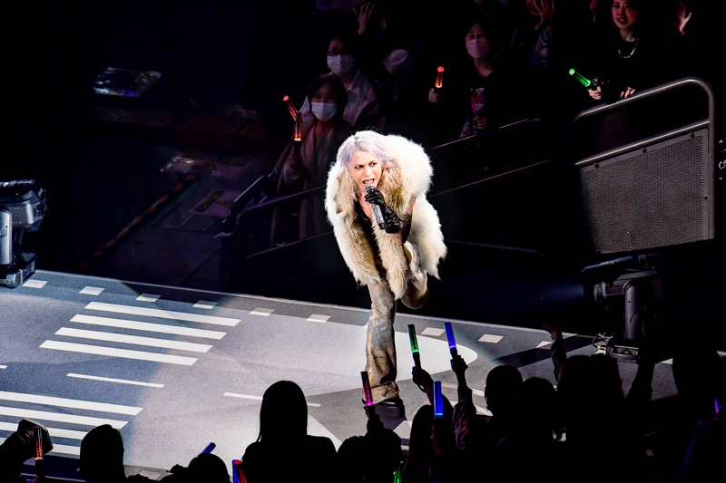 ここで初めて「さいたま! L’Arc-en-Cielです」とhydeは挨拶、yukihiroが合の手を入れるようにキックを踏み鳴らした。「どうですか? センターステージ。みんな近いね。全部見えるからね」とファンに語り掛けると、AIによる英語の同時通訳が字幕化。これはツアー初日にはなかった演出である。「今日も久しぶりの曲をたくさんやっております。マニアックな人たちが多いと思うので、ほぼ知ってる? 全部歌える? いい声してたね」などと話し掛け、その間ステージはゆっくりと回転していた。