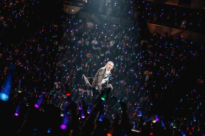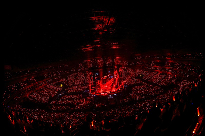 メリーゴーラウンドを思わせる円形のセンターステージと、そこから伸びる4本の花道。LEDスクリーンを備えた天蓋と台座の間を紗幕が覆っている。開演前から雨音を含むアンビエントなSEが流れていて、次第に雨足が強くなると場内は暗転。入れ替わりに、無線制御のオフィシャルグッズ“L’ライト”が観客の手元で色とりどりに点灯する。いよいよ開演である。
