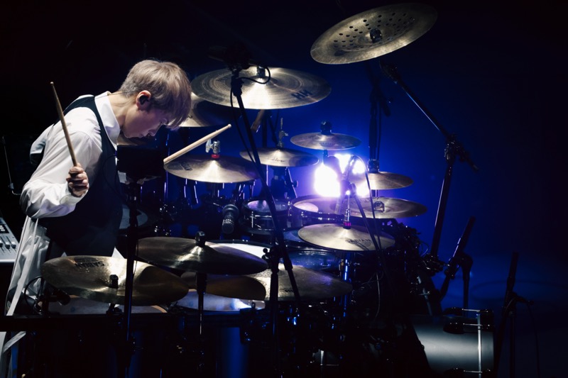 深遠な世界観に既に惹き込まれていたが、次曲「a silent letter」が始まると、更に一段深い奈落が存在していることに気付かされた。青から白へのグラデーションで制御されたL’ライトは客席を星空のように色どり、更に俯瞰で見れば、すり鉢状の底で回転し始めた円形ステージは、あてどなく銀河系を浮遊する大きな宇宙船のようだった。ツアー初日には虚ろなメランコリックさに魅入られたこの曲は、公演ごとに印象が変化。この日の表現からは、静かな祈りのような純粋無垢さを感じた。終盤、歌と演奏の昂りとシンクロして赤い光が加わっていく照明演出が鮮烈で、最後に静寂が訪れるその時まで、すべてが完璧に美しかった。
