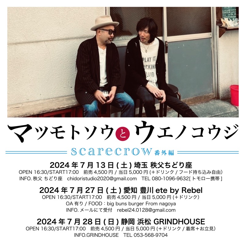 GOING UNDER GROUNDの松本素生(Vo, G )、ベーシストのウエノコウジが結成した新ユニットが、“マツモトソウとウエノコウジ”だ。2024年4月から全国8ヵ所で開催したライブツアー<スケアクロウ>は各地満員御礼にて終了した。その追加公演として、7月より3本のライブ<スケアクロウ>番外編が開催される。
