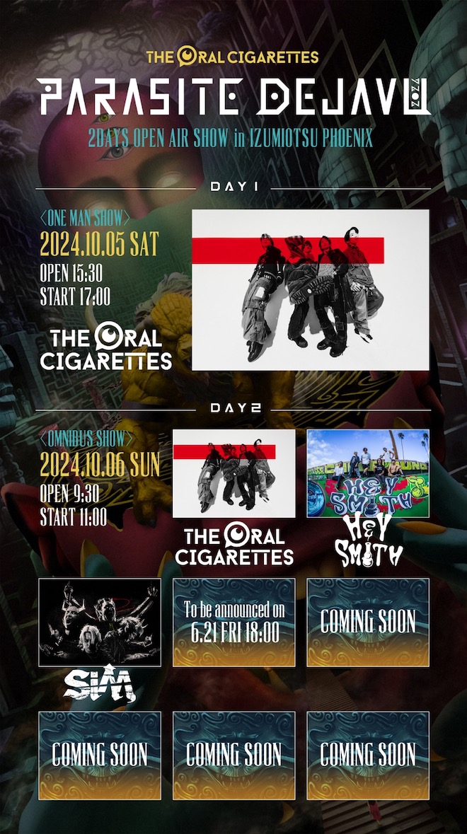 THE ORAL CIGARETTESが10月5日・6日に大阪・泉大津フェニックスにて<PARASITE DEJAVU 2024 〜2DAYS OPEN AIR SHOW in IZUMIOTSU PHOENIX〜>を開催する。