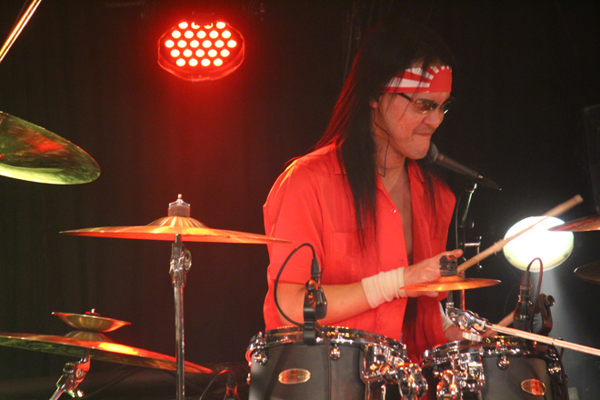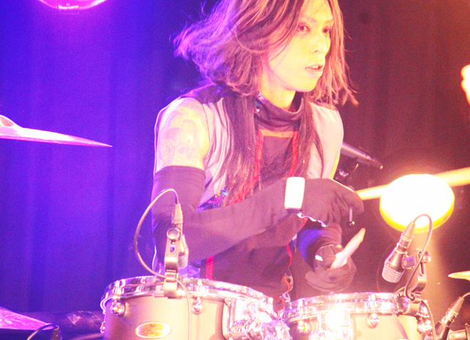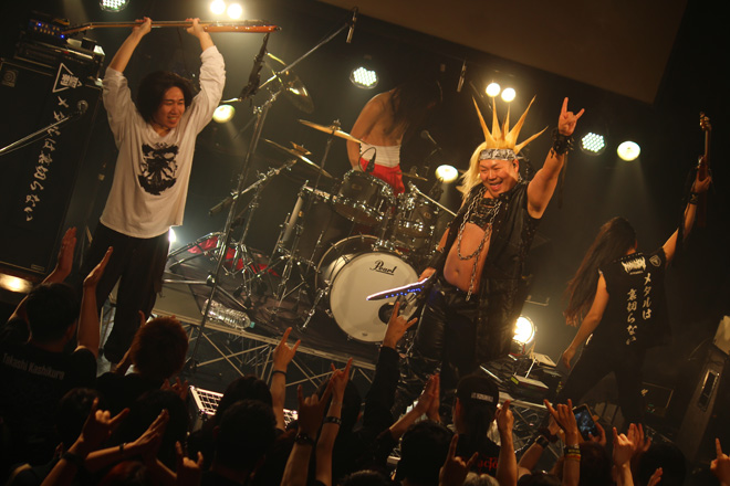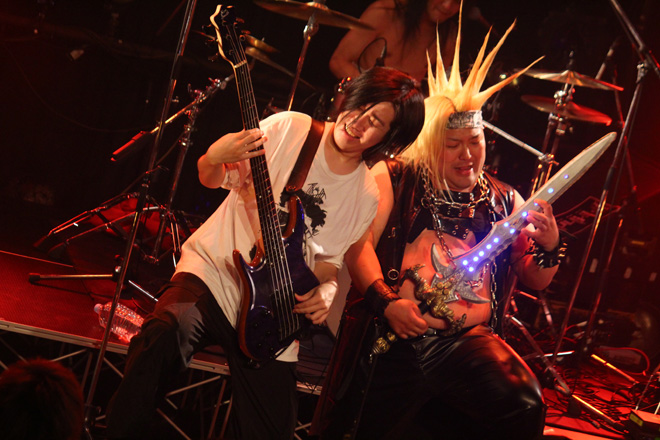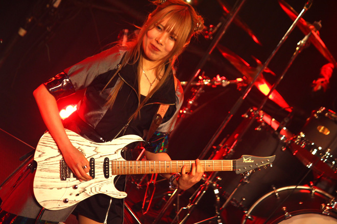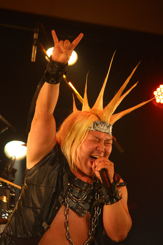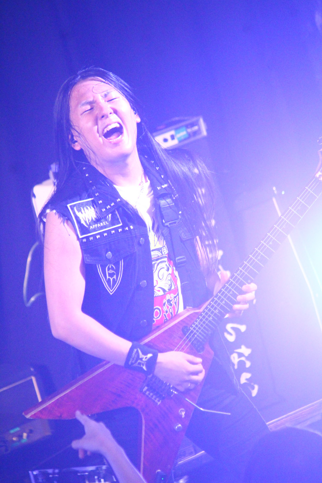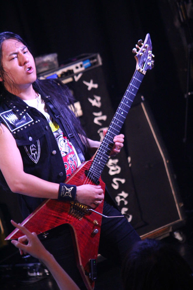 続くPHANTOM EXCALIVERも、大いに場内を盛り上げた。昨年度の<Metal Battle Japan>で日本代表の栄冠を勝ち取り、由緒正しきドイツの巨大メタル・フェス<Wacken Open Air>の場で行なわれた世界大会でも堂々の優勝。そのうえこの8月にも同フェスへの出演が決定している彼らは、着実に活動領域を世界へと広げつつある。しかもそんな具合に状況が好転しているのみならず、ライヴ・バンドとしての説得力向上にも顕著なものがある。この日も代表曲の数々を惜しみなく連射しながら、ポジティヴな力に満ちたステージを披露し、その場の温度を高めることに成功していた。