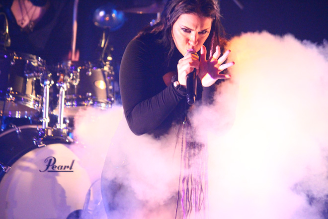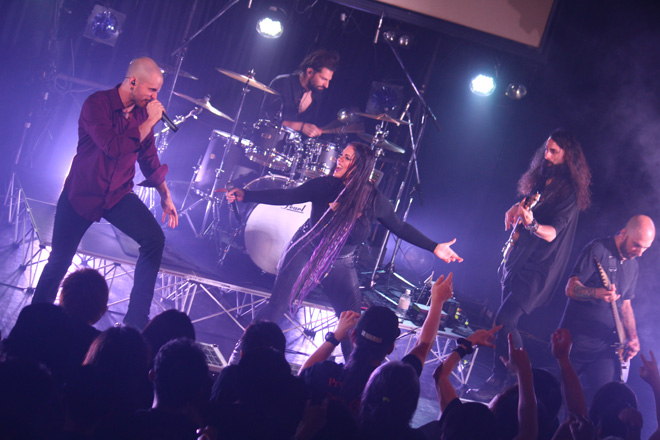 ただ、結論から言えば、過去にもサポート歴にあるガブリエレの貢献も光っていたし、彼とギター兼ヴォーカルのマルコ・パストリーノ、紅一点のクリスティン・スターキーとのコンビネーションも見事だった。いわゆるクリーン・ヴォーカル専任者と、シャウトやグロウルを担当するヴォーカリストが混在する編成のバンドは昨今まったくめずらしいものではないが、このバンドの場合はそうしたスタイルではなく、3人の歌い手すべてがメロディを豊かな声量で歌いあげ、しかもそれぞれに色調の異なった力強い歌唱を聴かせるのだ。そのさまは、まさしくロック・オペラ。過度に芝居がかったパフォーマンスが展開されるわけではないが、異なった歌声同士のブレンドや噛み合い方も見事で、片時もステージから目が離せなかった。