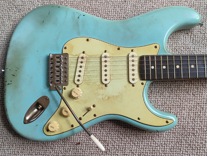 これはすごいなあ。ピックガードはもともとどういうレリック具合だったのかわからないけど、ソニックブルーの塗装がこんなにイッちゃうなんて、相当弾き込んだということですよね。もともとボディはどんなカラーだったのでしょう。サンバーストかな。確かにそのままオーバーフィニッシュしてしまっているビンテージ個体も多いですから、いくつもの層が剥がれてレイヤーになると超カッコいいよなあ。何気に22フレットだったり、ちょいと廉価なブリッジだったりする点は御愛嬌だけど、めちゃいい音する雰囲気が醸し出ています。(BARKS 烏丸哲也)