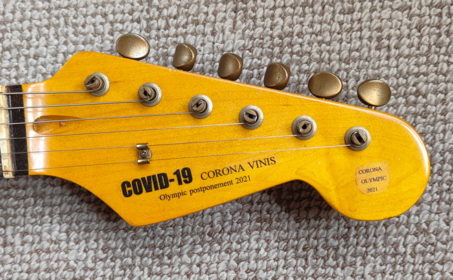 メルカリで購入。ナット幅が狭く弾きにくいので中国製のものに交換。コロナが流行っていたのでパロディーロゴ作成。