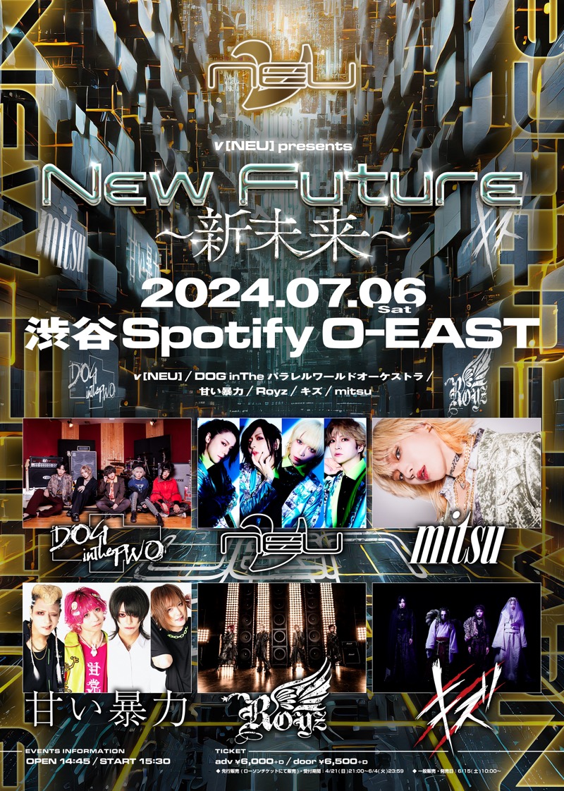 ラスト主催イベント<New Future~新未来~>のコンセプトは、“想像できなかった新しい未来”。ν[NEU]とそのボーカリストmitsu、DOG inThePWOやRoyzといったほぼ同期、初共演となるキズや甘い暴力との共演がどんな化学反応を生み出すのか、お楽しみに。チケットのローソンプレリクエスト先行受付6月4日(火)23:59まで。