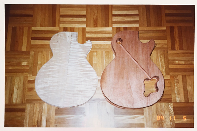 数多くのギターを作ってきた下田さんの写真を見ていると、今更ながら、このクオリティを40年前に自作でこしらえちゃっていたなんて、にわかには信じがたく驚愕ひとしきり。自宅で撮ったと思しきトップとバックの写真をみると、見事な市松張りの床が確認できますが、もしかしたらお家には木工機械などの環境があったのでしょうか。何よりネットもなかった時代に、みごとな製図をどうやって書いていたんでしょう。治具も自作していたのかな。頭が垂れるとはまさにこのことです。(BARKS 烏丸哲也)