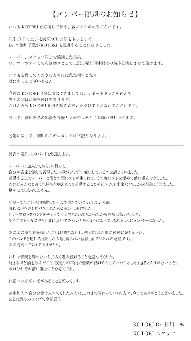 KOTORIのドラム・細川千弘が脱退することが発表された。6月18日に渋谷・Spotify O-EASTよりスタートするワンマンライブツアー<Japanese Super Perfect Tour>が、現体制でのラストツアーとなる。なお、今後は、サポートドラムを迎えて活動を続けていくとのこと。