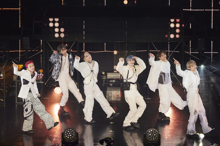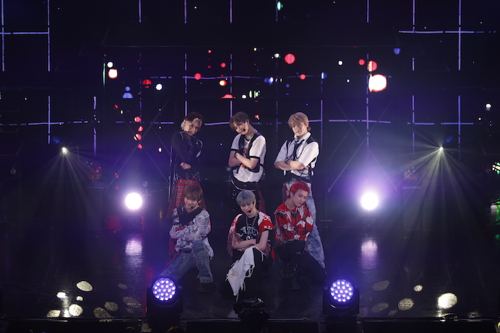 「First Flight」のイントロアレンジや、「Snowin‘」のダンスブレイクアレンジ、メンバー自身が作り上げたオリジナルユニット曲など、このライブでしか見ることのできないステージが続く中、ステージ全体のLEDの色が白と青の光の演出で、会場のムードが一変。赤を基調とした新たな衣装にチェンジしたメンバーが再登場し、5月31日(金)に配信がスタートした1stアルバム『Quest』収録曲「DRAW+ing」を力強くパフォーマンス。さらには「モグモグ(YumYum)」「Switch」とアルバム収録曲をいち早く会場にいるNICO(ファンの呼称)に披露した。田中笑太郎は「みんなこの曲をもっと聴きたいと思うけど、7月17日に音源が配信されるのでそれまで楽しみに待っていてね!」と伝える。