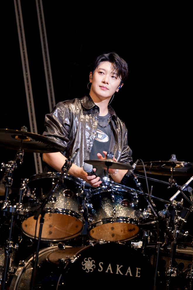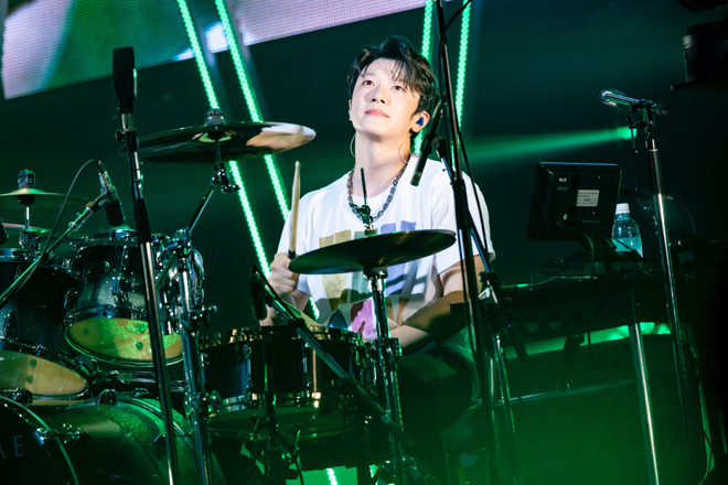 1部の後半は、ミンファンの「DRUM SOLO」でスタート。重く正確なミンファンのドラムが会場を沸かせると、そこから力強いドラムが映える「Take Me Now」へなだれ込み、ハードロックパートへ突入。「Time To」の一体感でロックのパッションは最高潮を迎えた。