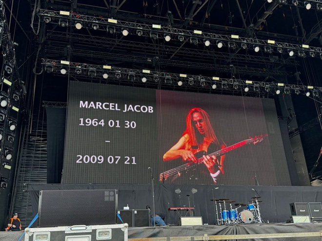 今回はマルセルの生誕60年を記念した特別な出演ラインナップであり、バンドメイトであるジェフ・スコット・ソート(Vo)、フレドリック・オーケンソン(G)、ジェイミー・ボーガー(Dr)が集結し、マルセルの代役はヨハン・ニーマン(エバーグレイ)が務める事をフェスティバル開催約2ヶ月前に発表されたのである。