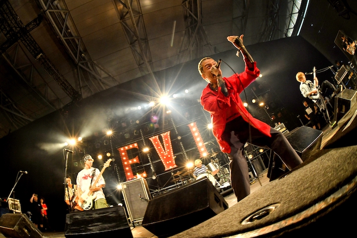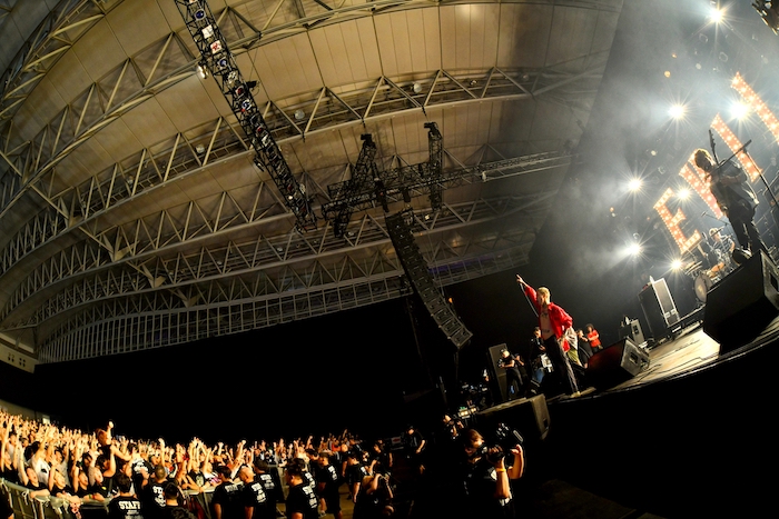 「お前らの力、全部貸してくれ!」と叫び、GENは1曲目からフロアに分け入り、観客をゼロ距離で焚きつけていく。次の「F.P.P」に入ると、メンバーはその場で飛び跳ね、観客もそれに追随し、演奏が進むにつれてサークルモッシュも勃発。いい意味で幕張メッセは濃密な空気が立ち込めるライブハウスと化していた。
