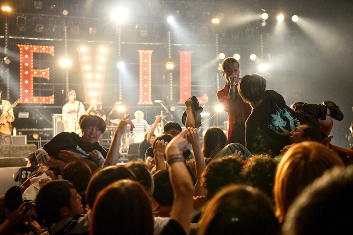 その感情を爆発させたのが6月に出たばかりの新曲「Happy」だ。歌メロとシャウトを交互に使い分けるヴォーカルといい、ハードコア特有のヘヴィさを叩きつけながら、どこまでも明るく開けた曲調といい、バンドの新たなアンセムと言える超強力ナンバー。フロアのリアクションも好調で、今後さらに成長を遂げていく楽曲になるのではないか。