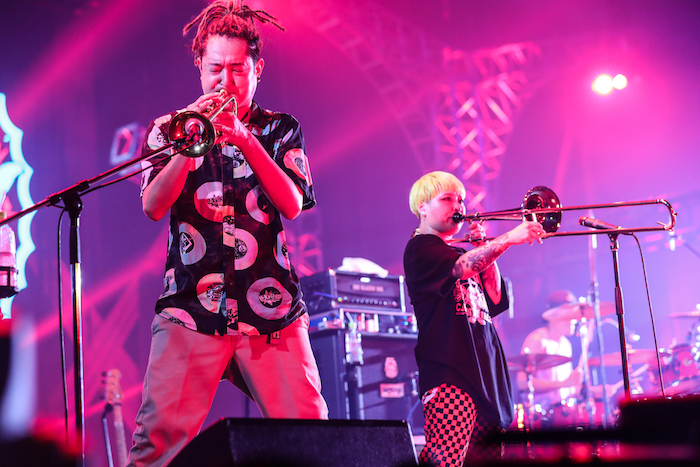 哀愁の中にジャジーなテイストも入り混じる「Endless Sorrow」、「回れ回れ」と指で合図した猪狩に応え、観客がサークルピットを作った「Drug Free Japan」、とびきりポップな魅力に加え、イイカワケン(Tp)、満(Sax)、かなす(Tb)、Task-n(Dr)が回したソロも見どころだった「Radio」と観客を存分に踊らせた中盤。