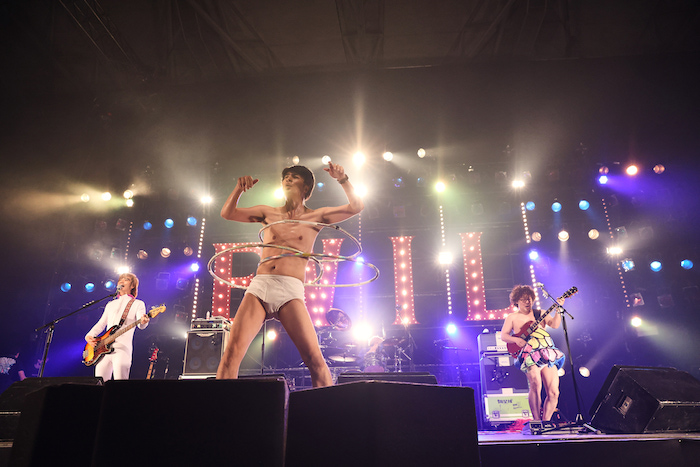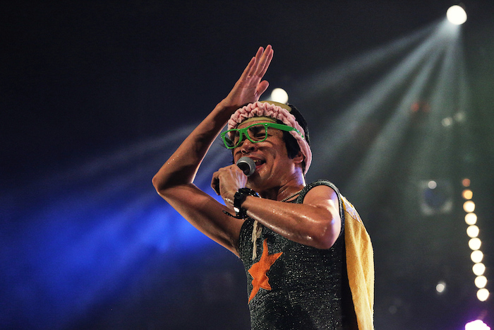 今回の<SATANIC CARNIVAL>はとくに転換時間が短く、あらかじめセットした各バンドのステージをスタッフが人力で押して入れ替えていくものとなっているのだが、「久しぶりに出演したんですけど、すごいわ。ステージの転換」と感心するまさやんに、「それは、スタッフと拙者が朝から押していたんだよ」とステージ袖から“ちょんまげマン”(北島)が登場。キャラ大渋滞で「ちょんまげマンのテーマ」を披露したあとは、抜群のバンド感とパフォーマンス力で会場をどんどん巻き込んでいく「Mr.Cosmo」へ。