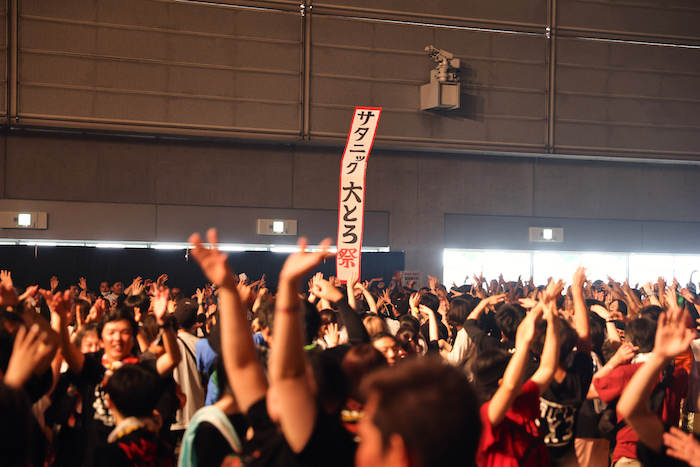 「今からみんなでUFOを呼びたいと思います」というU太の指揮で観客のシンガロングを起こすなか、袖から“スシロー”の看板を持った北島が登場した。U太はまさやんに「今日はBRAHMANが出ているから、TOSHI-LOWさん作ってって言ったよね?」というミスもありつつ、北島は“サタニック 大とろ祭り”とかいたスシロー風の巨大のぼりを手に、フロアを練り歩いてEVIL STAGEを盛り上げていく。