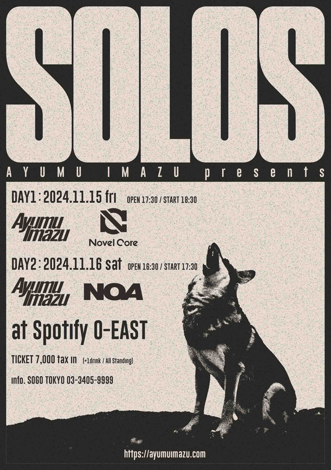 2024年11月15日(金)、16日(土)に東京・Spotify O-EASTで2days開催されるAyumu Imazuの自主企画LIVE<AYUMU IMAZU presents “SOLOS”>にて、登場するゲストアーティストが発表された。11月15日(金)にはNovel Core、11月16日(土)にはNOAという熱いラインアップだ。