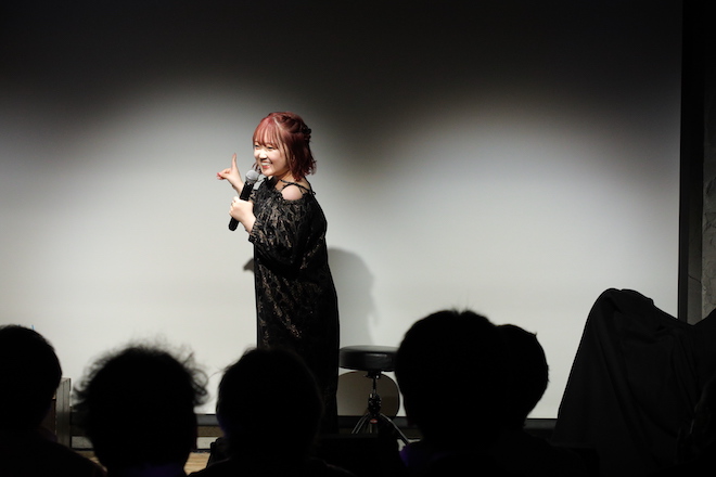 歓声の中、舞乃空はブラックとゴールドの大人な雰囲気の衣装で登場。自身のYouTubeチャンネル“歌ってみた”シリーズが人気の彼女だが、この日もオリジナル曲に加え、1980年代〜1990年代前半の大ヒット曲のカヴァーを数多く披露し、大阪弁が混じる気さくなトークと共に観客を楽しませた。