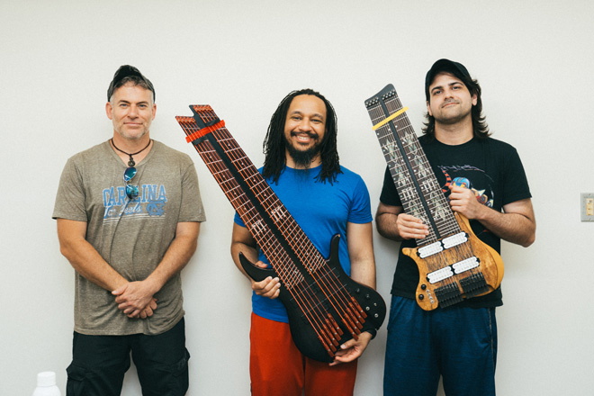 ジョアン:最初はヴィクター・ウッテンやマイケル・マンリングの教則ビデオを見て、4弦ベースを練習していたんだ。でも、よりプログレッシヴなミュージシャンと共演するようになって物足りなくなって、5弦ベースを弾くようになった。それが昂じて10弦ベースに至ったんだよ。今ではフェリックスとやるときでなくとも10弦ベースを弾いているよ。パーカッションをフィーチュアしたバンドでは多彩なベース・プレイを活用できるし、ベーシックなトリオ編成でも役立てることができる。ギタリストがソロを弾いているときにボトム・エンドを支えて、ハーモニーを弾いたりね。試行錯誤の連続だった。自分で道を切り開くしかなかったよ。