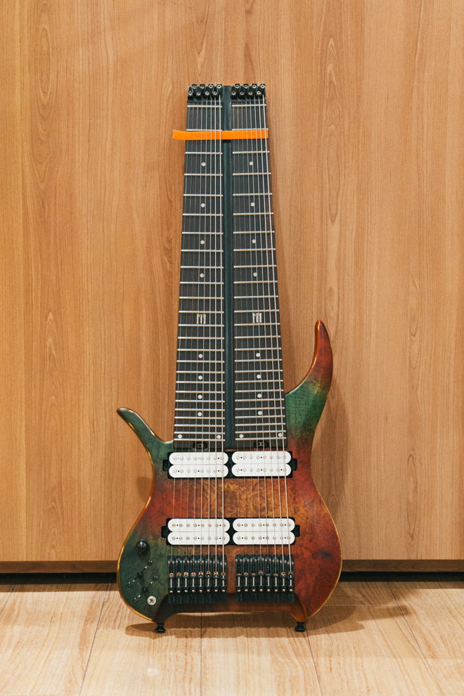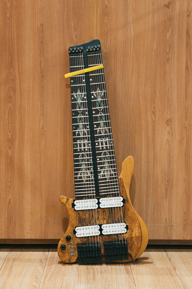 フェリックス:16弦ギターはひとつのボディに8弦ギターのネックを2本並べて付けたものなんだ。弦のチューニングもレギュラー・チューニングのものを2本並べている。ただ、それは俺がそうしているだけで、手にした人がそれぞれ異なったチューニングで弾いてくれたら嬉しい。独創的な奏法を生み出してくれたら最高だね。