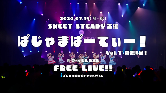 <ぱじゃまぱーてぃー! Vol.1>は、6月10日(月)にリリースされたSWEET STEADYの新曲「ぱじゃまぱーてぃー!」のリリースを記念して開催される単独公演で、「ぱじゃまを着用して来場」することでチケット代0円(入場無料)で参加することができる。