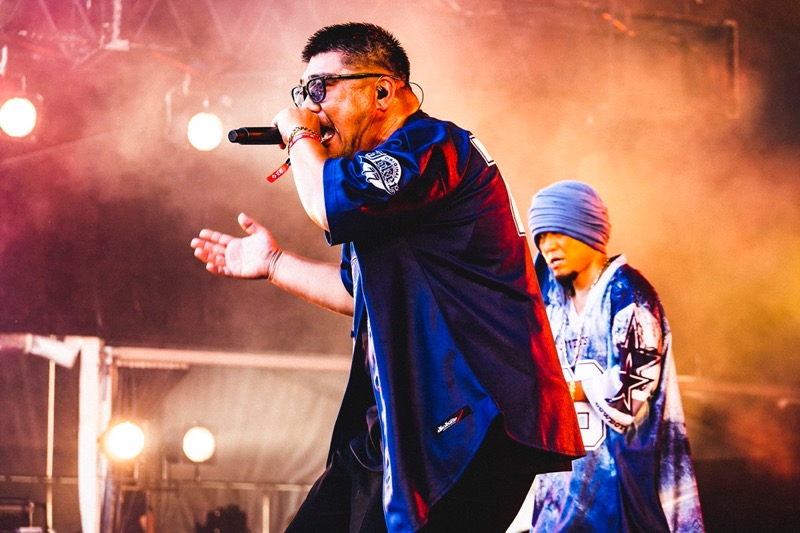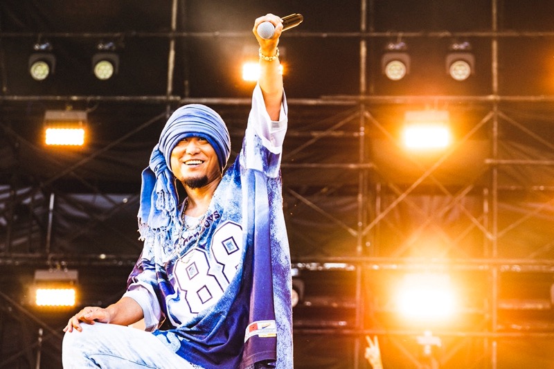 「全然あがってない。俺たちの知っている京都大作戦ではない。10-FEETと兄弟みたいな関係なのに。京都大作戦のお客さんはパーッと盛り上がって、それでパーッとなって、パーッじゃないのか。…次に出てくるのは湘南乃風!」と、ライブは仕切り直しで、自らオープニングMCまでするHAN-KUN。この一件がオーディエンスに完全に火を点けた。改めて始まった「黄金魂」からゴリゴリのダンスホールが、太陽が丘に生まれることに。タオルを振り回し、客席エリアの後方では湘南乃風の巨大フラッグを振るオーディエンスも。