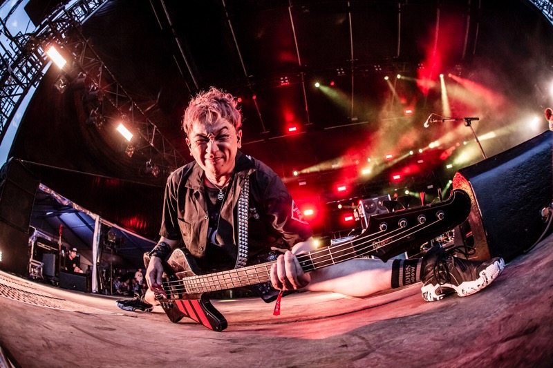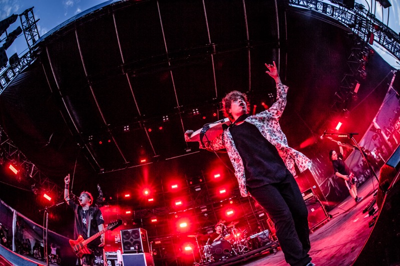 なにしろ、直後に投下したのは最新シングルからの新曲「gg燦然」。関西では今年3月からテレビやラジオで流れているから、リリース前から曲を知っているファンも多いだろう。TAKUMAが熱狂的タイガースファンであることも。野球愛も投影させると同時に、メタルにも強く影響されたルーツや遊び心も反映させたのが「gg燦然」だ。そのスリリングな展開に刺激されまくったオーディエンスは、思う存分に飛びまくる。熱を帯びていくばかりのライブに、これでもかと10-FEETは「ハローフィクサー」を響かせていった。
