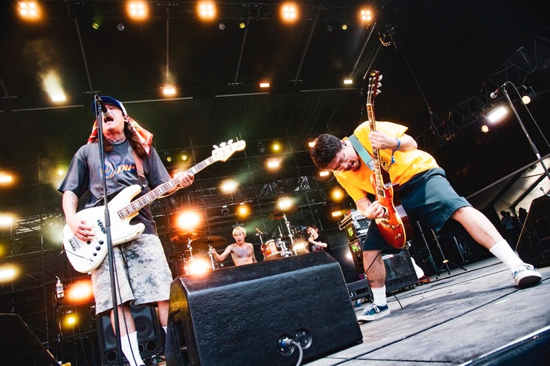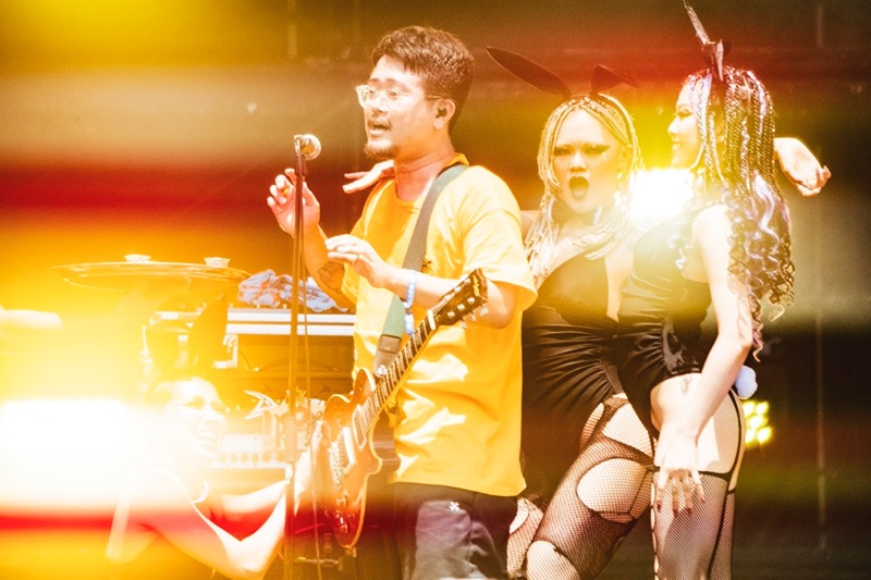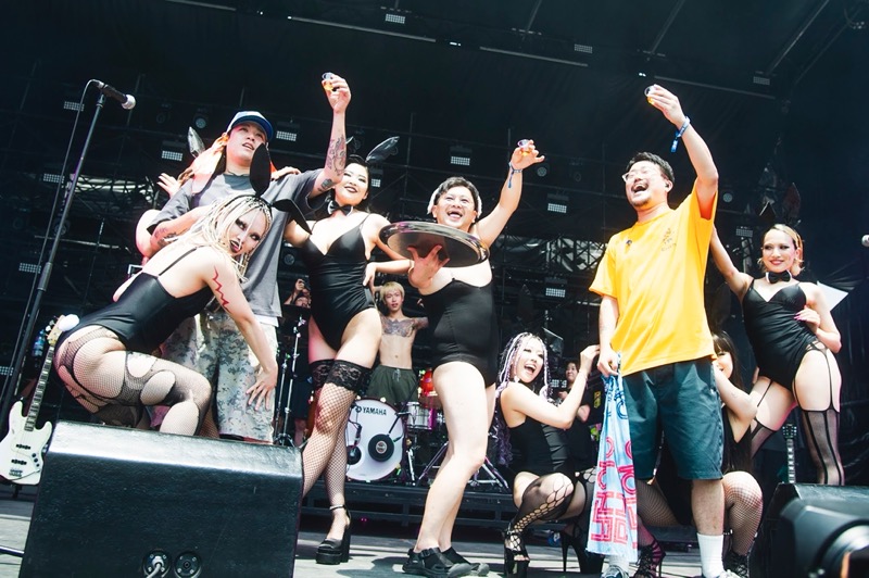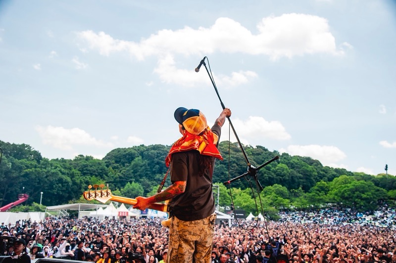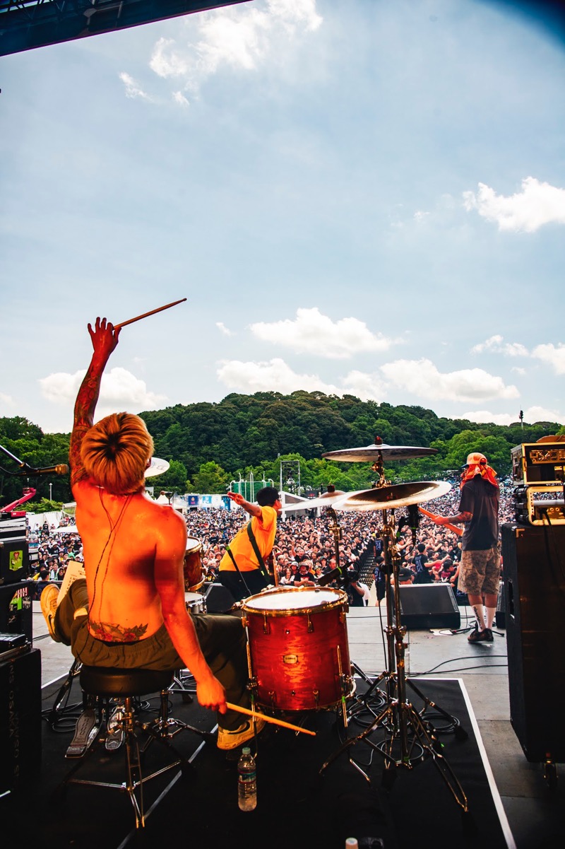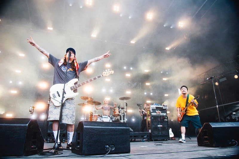 それに合わせてオーディエンスも同じようにピュッピュッと歌う午前中の太陽が丘だった。そこから入った「LOVE ME MORE」はパンクのストレートな気持ち良さ全開。再びバニーガールが現われ、ナオキはバニーガールから渡された酒を一気飲み。ステージングもギターサウンドもキレ味を増してオーディエンスを巻き込んでいく。奇想天外なネタをぶっ放し、パンクもメロディックもファンクもレゲエもごちゃ混ぜにしていくENTHのミクスチャーっぷりは痛快だ。「WHATEVER」に入ったときには、太陽が丘はクラウドサーフもモッシュも続出。ライブハウスさながらの光景が繰り広げられた。