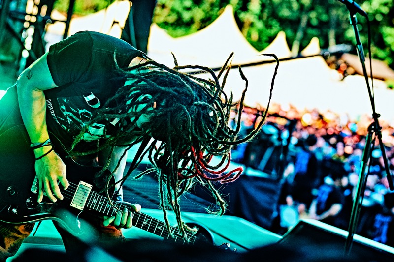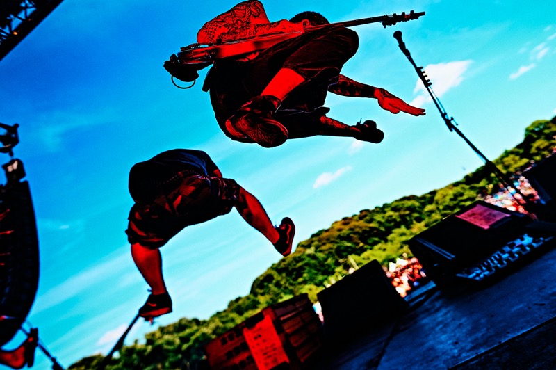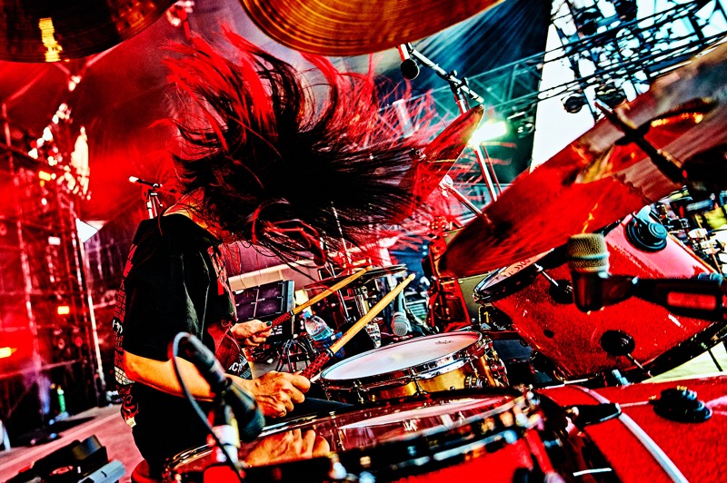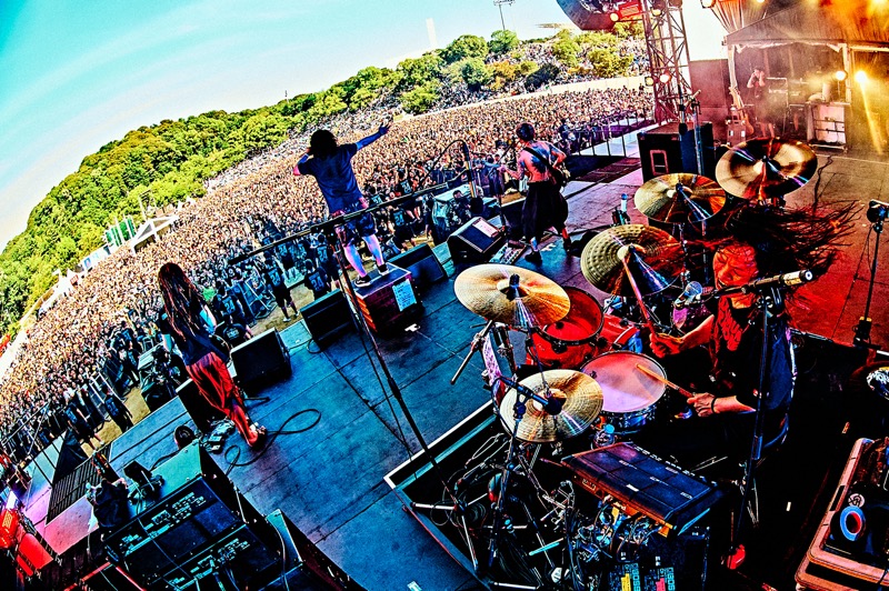 どんだけひもじい思いをしていたんだ。次なるバンドの開演が迫る中、ざわ…ざ…ざわ…と増え続ける人の群れ。その全員が腹ペコである。前から後ろまで、丘の斜面づたいのあらゆる面も、どこからどこまでも腹ペコしかいない。飢えた餓鬼を前にSEが響けば、一斉に起こるハンドクラップと大歓声。それを全身で受けステージに現われたマキシマム ザ ホルモン。ナヲはメタルポーズをまず一発決め、マキシマムザ亮君は不敵な笑みを浮かべる。手つきで煽るのは上ちゃん。