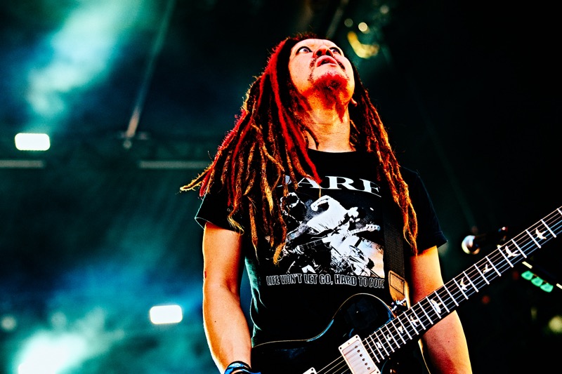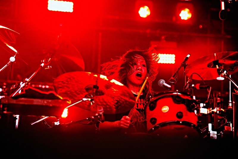 今度は腹ペコを覚醒させるような叫び声をダイスケはんが上げ、曲は「鬱くしき人々のうた」に突入。マスゲームのごとく一糸乱れぬ強烈なヘドバンでガン決まりの腹ペコだ。そのエネルギーは太陽が丘の最高気温も熱狂度数もたちまち更新させていく。極悪にしてハイテンションの音をまき散らすマキシマム ザ ホルモンだが、ダイスケはんは腹ペコの全員を受け止めるように腕を広げるような仕草も。こうなれば、腹ペコは安心して自分自身を解放していくのみ。続く「恋のアメリカ」でも、ダンスとカオスが酷暑の太陽が丘を激しく彩っていくばかりだ。
